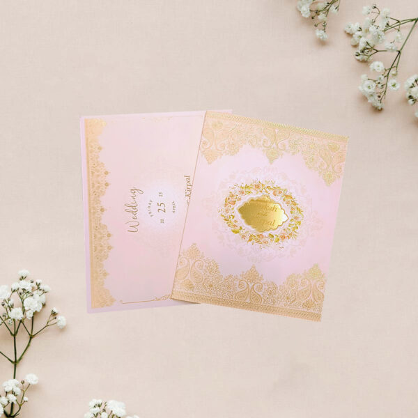 Embrace timeless elegance with our Blush Royale Wedding Invitation, designed in a soothing pastel pink with intricate gold foiling. The card features a regal lace-inspired border and an ornate central frame that highlights the couple’s names beautifully. Perfect for couples who adore a touch of luxury and sophistication, this design effortlessly combines tradition with modern finesse.