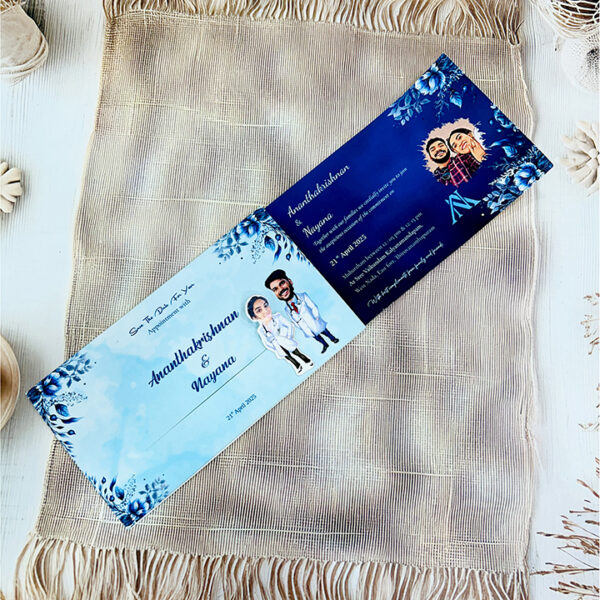 This beautifully designed “Save the Date” wedding invitation card is a perfect blend of elegance and creativity. Featuring custom caricature artwork of the couple, floral borders, and a vibrant theme, this card captures the joy and excitement of the upcoming celebration. With a touch of personalization, it makes your announcement stand out while keeping it classy and memorable. Ideal for couples who want a modern yet traditional way to let their loved ones mark their calendars.