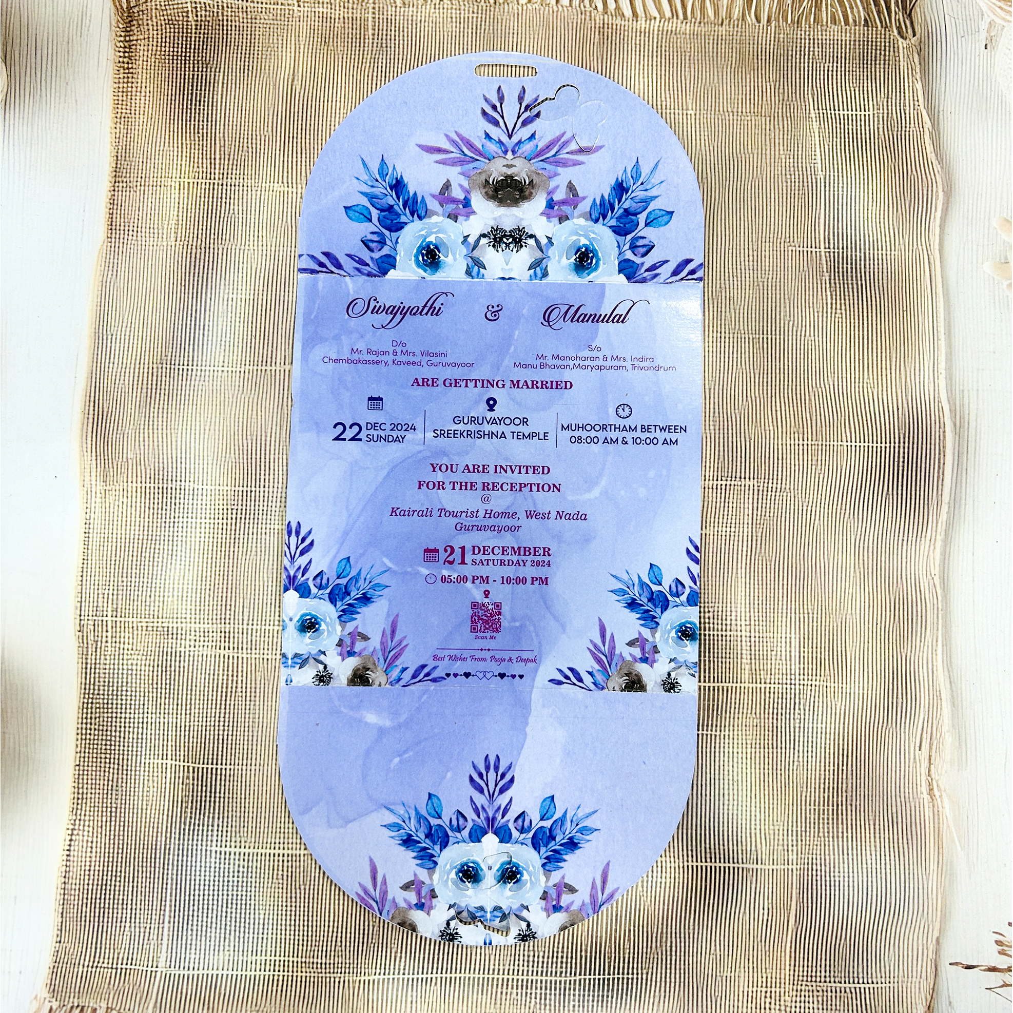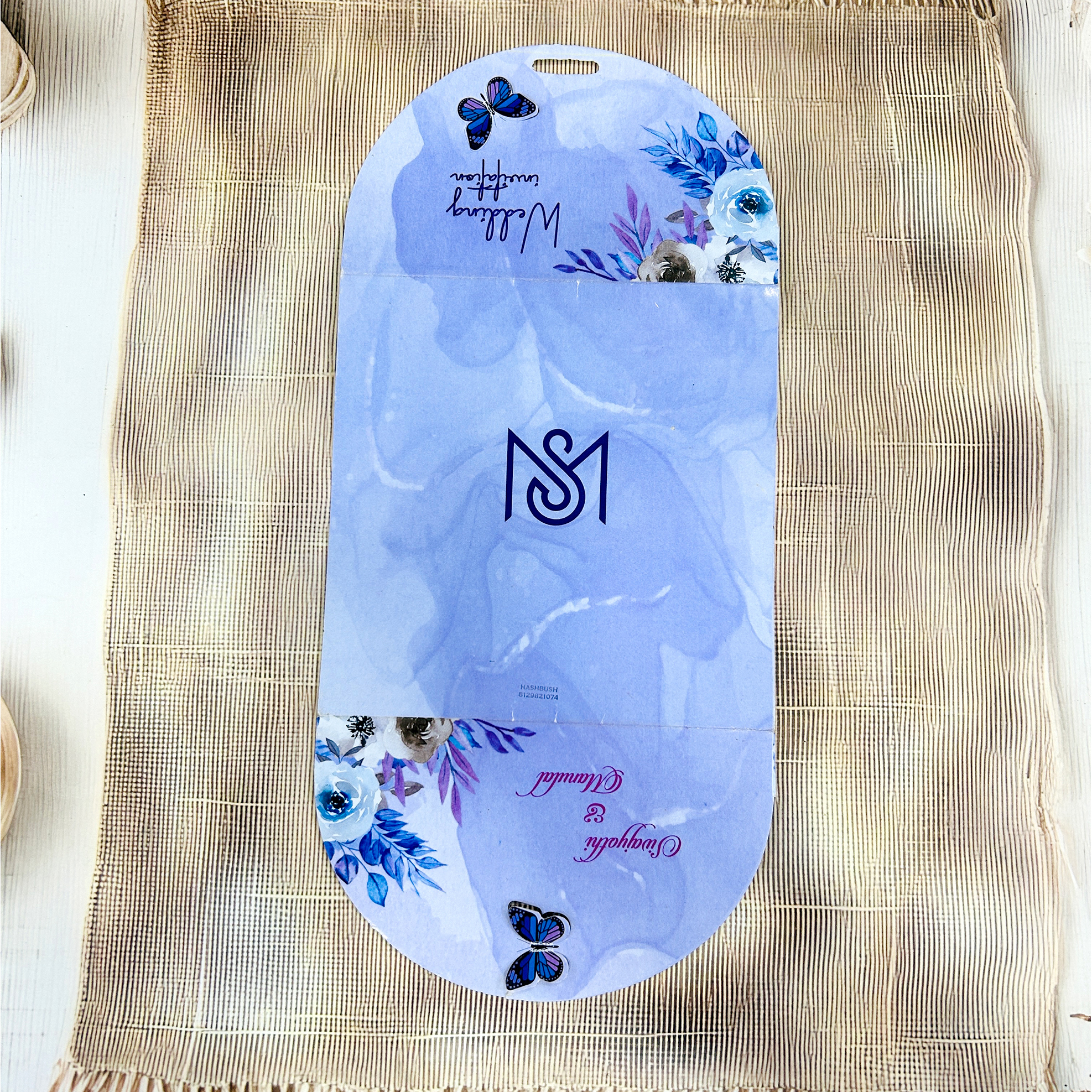 Celebrate your wedding with elegance and charm using this beautifully designed invitation card. The card features a soothing lavender-purple background adorned with delicate floral patterns and butterfly motifs, symbolizing love and new beginnings. Its unique envelope-style fold adds a touch of sophistication, making it a perfect choice for couples who prefer a stylish yet traditional design. This invitation ensures your guests will treasure the first glimpse of your big day.