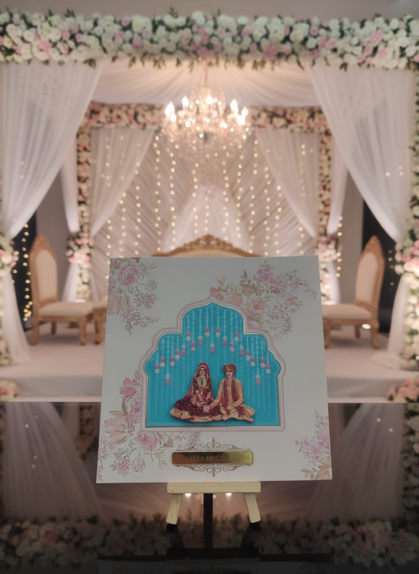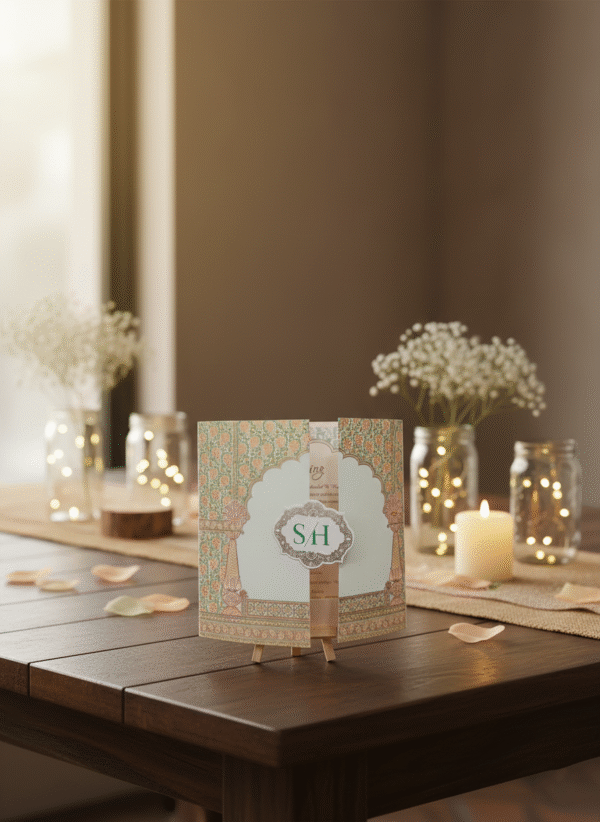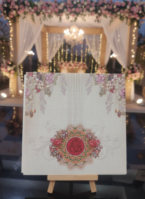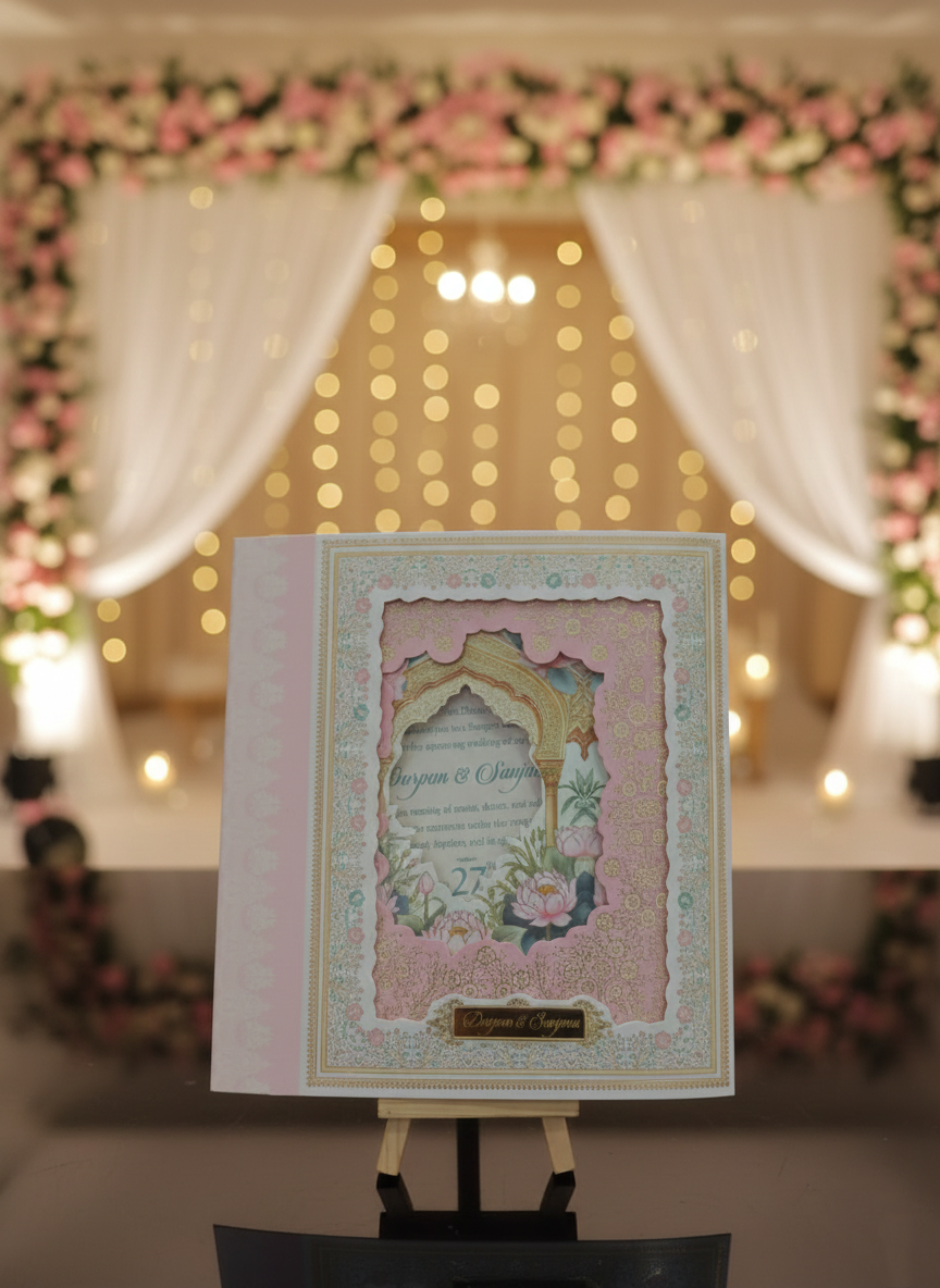 Embodying timeless elegance and cultural richness, this traditional wedding card is crafted to celebrate love with grace and grandeur. The design features intricate floral motifs, layered scalloped detailing, and a heritage-inspired arch window that beautifully frames the invitation text within. Soft pastel shades paired with gold embellishments enhance the royal charm, while the floral backdrop adds a serene and romantic touch.