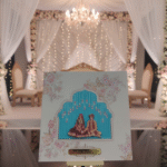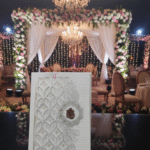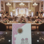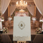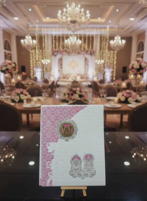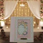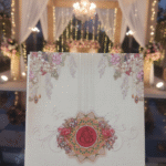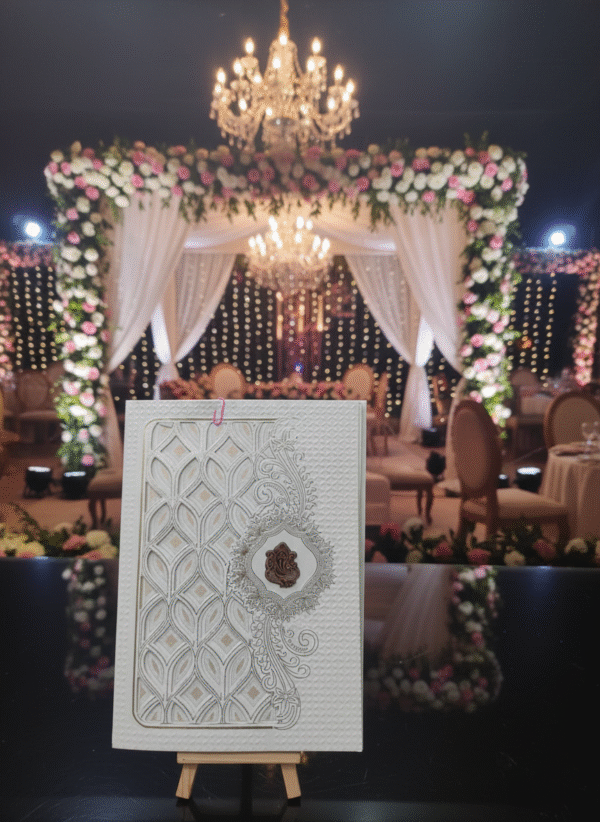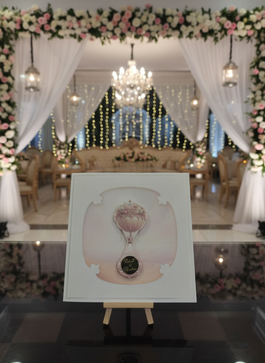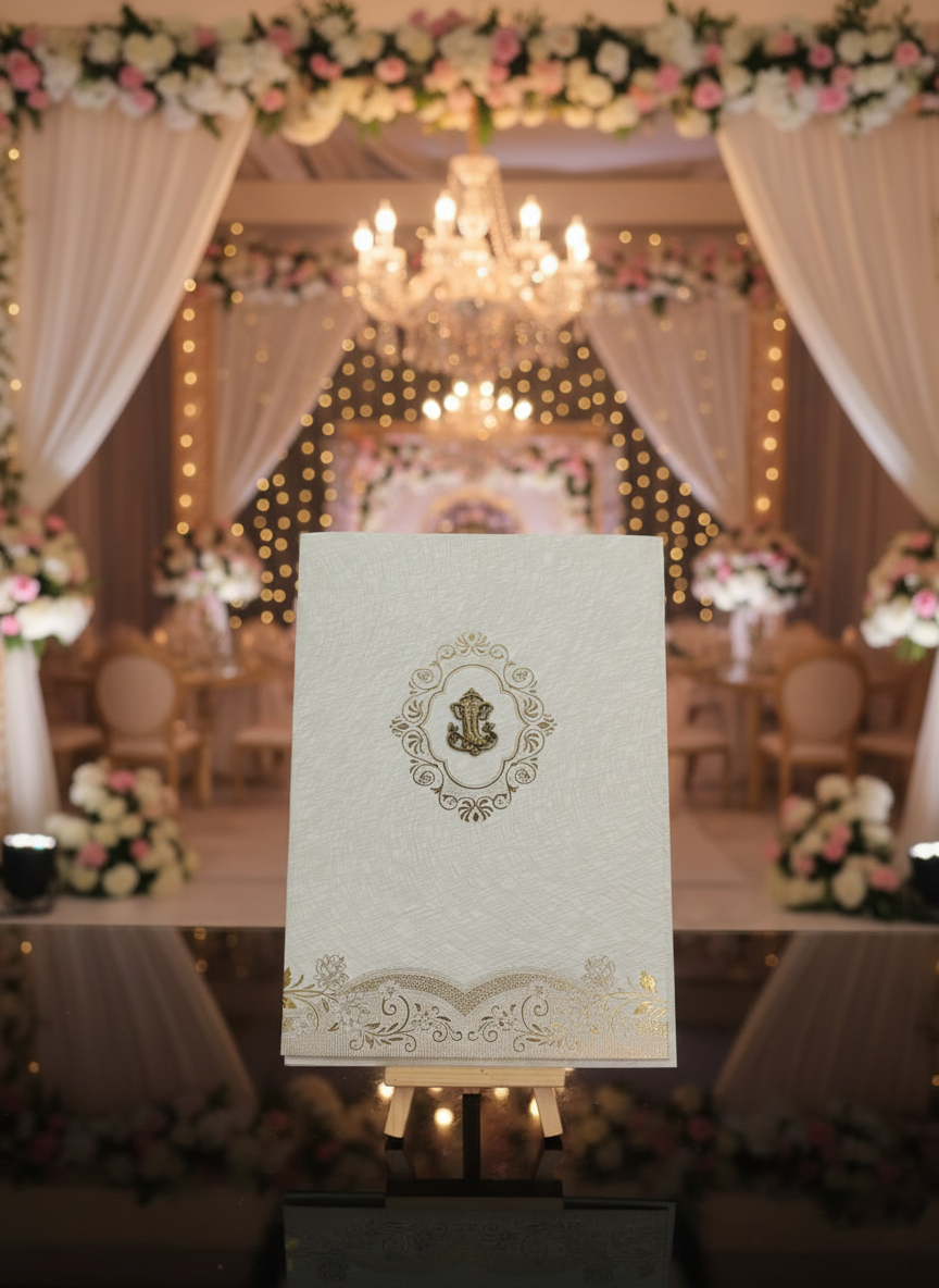 Embodying timeless elegance and cultural richness, this traditional wedding card is crafted to celebrate love with grace and grandeur. The design features intricate floral motifs, layered scalloped detailing, and a heritage-inspired arch window that beautifully frames the invitation text within. Soft pastel shades paired with gold embellishments enhance the royal charm, while the floral backdrop adds a serene and romantic touch.