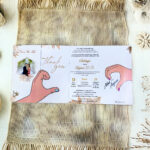 A stylish Save the Date card blending modern romance with artistic design. One side features a couple’s photograph inside a geometric floral frame, while the other side highlights two illustrated hands forming a heart shape — symbolizing love and togetherness. The pastel pink background with subtle floral details adds a soft and elegant touch, making it perfect for announcing the big day.