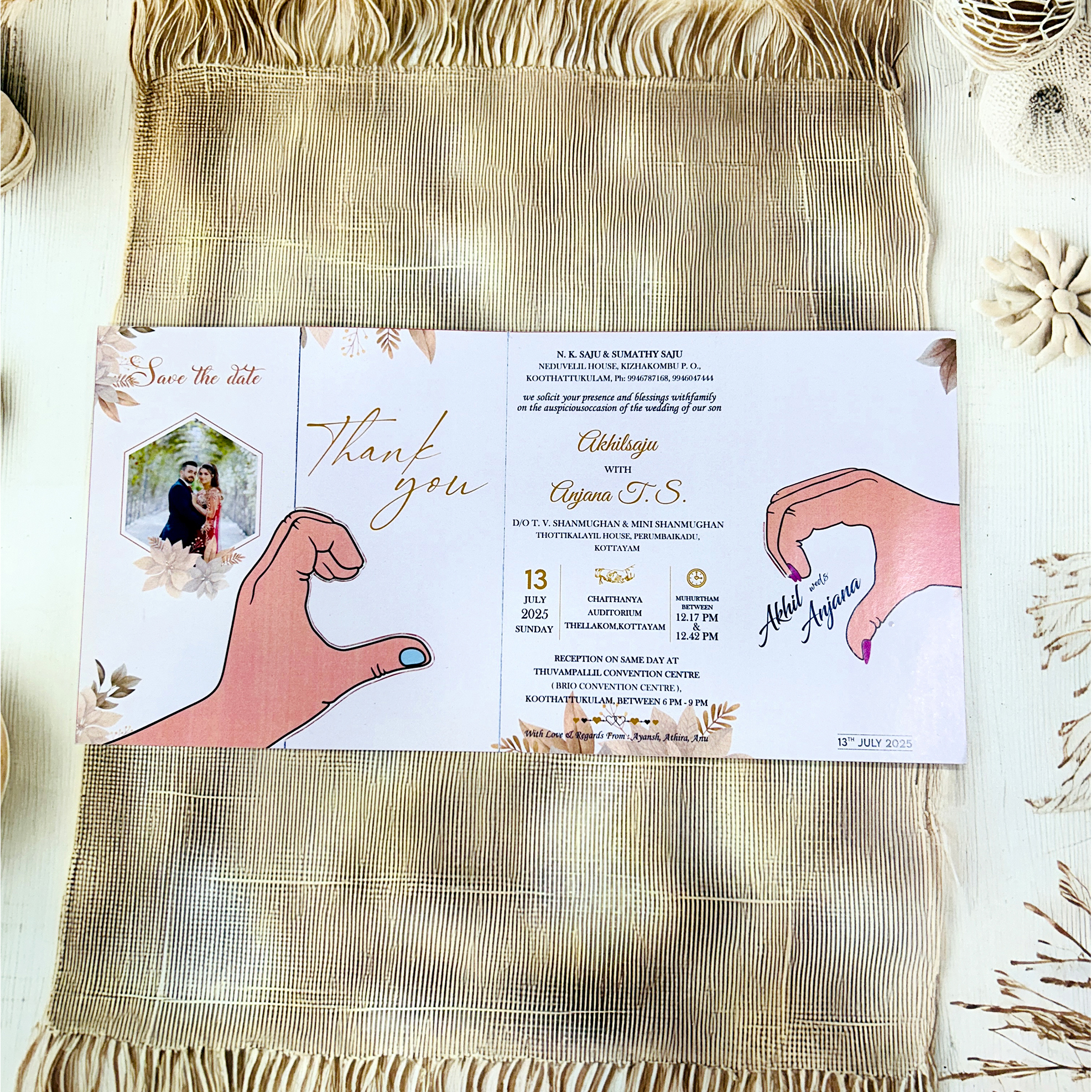 A stylish Save the Date card blending modern romance with artistic design. One side features a couple’s photograph inside a geometric floral frame, while the other side highlights two illustrated hands forming a heart shape — symbolizing love and togetherness. The pastel pink background with subtle floral details adds a soft and elegant touch, making it perfect for announcing the big day.