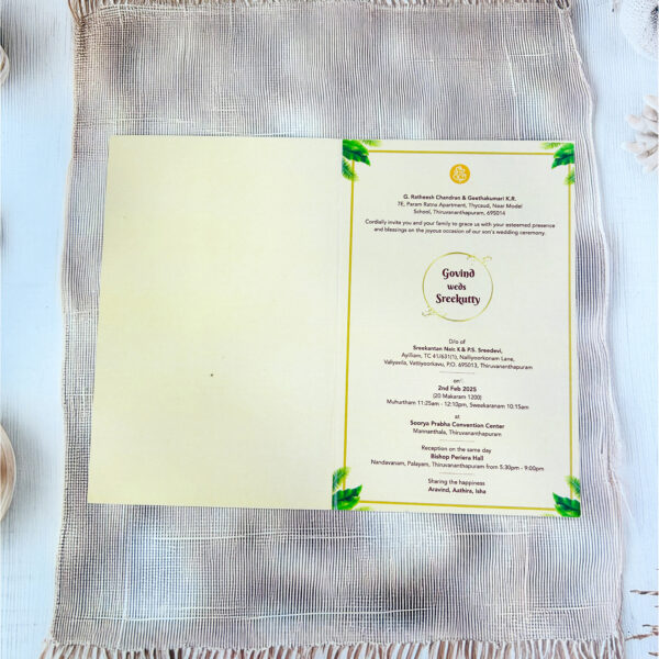 This wedding card features a vibrant nature-inspired design with lush green leaves and tropical foliage surrounding a caricature-style couple illustration. The soft pastel background with a golden circle centerpiece gives it a fresh and elegant appeal. The design beautifully blends tradition with modern artistry, making it perfect for couples who love a natural and earthy vibe.