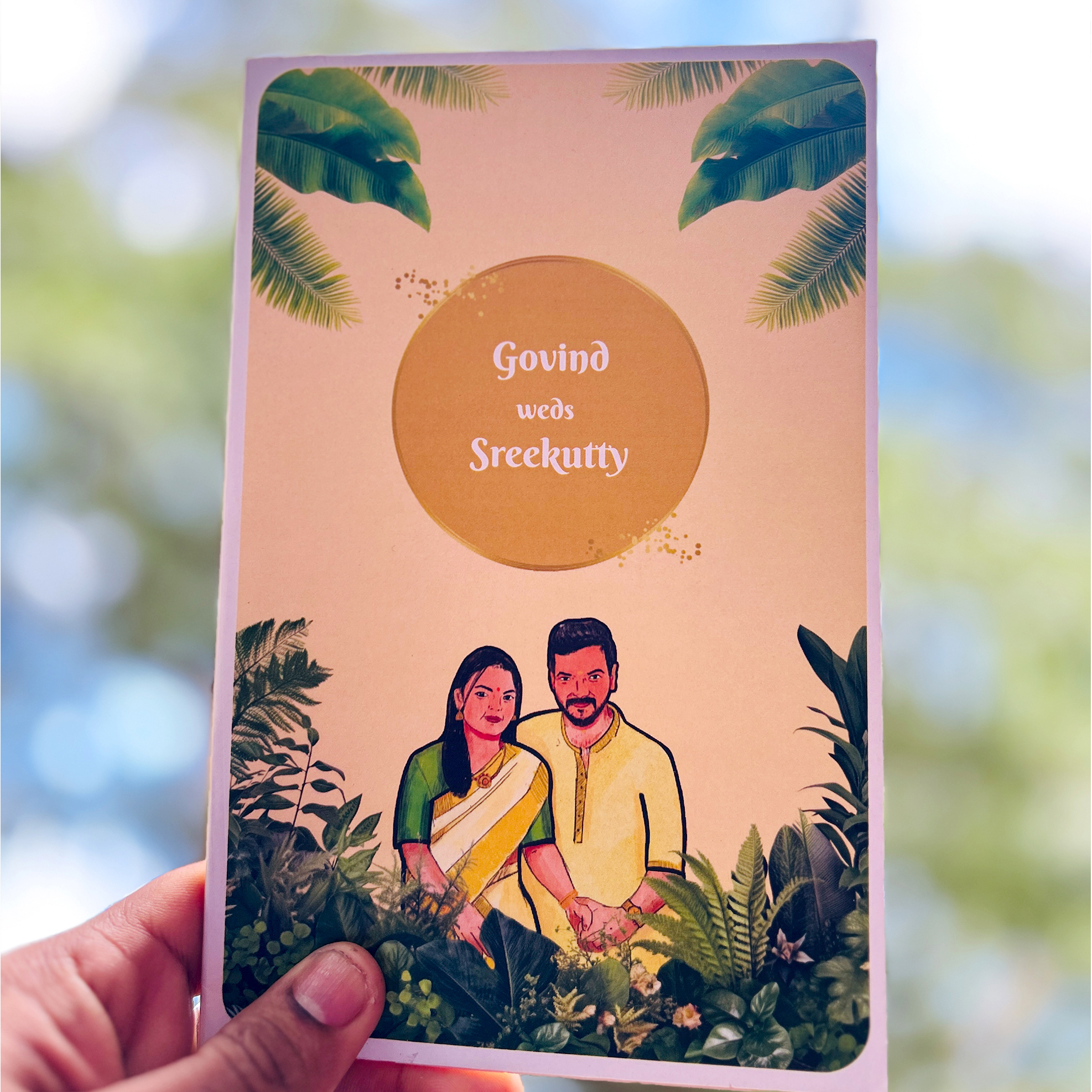This wedding card features a vibrant nature-inspired design with lush green leaves and tropical foliage surrounding a caricature-style couple illustration. The soft pastel background with a golden circle centerpiece gives it a fresh and elegant appeal. The design beautifully blends tradition with modern artistry, making it perfect for couples who love a natural and earthy vibe.