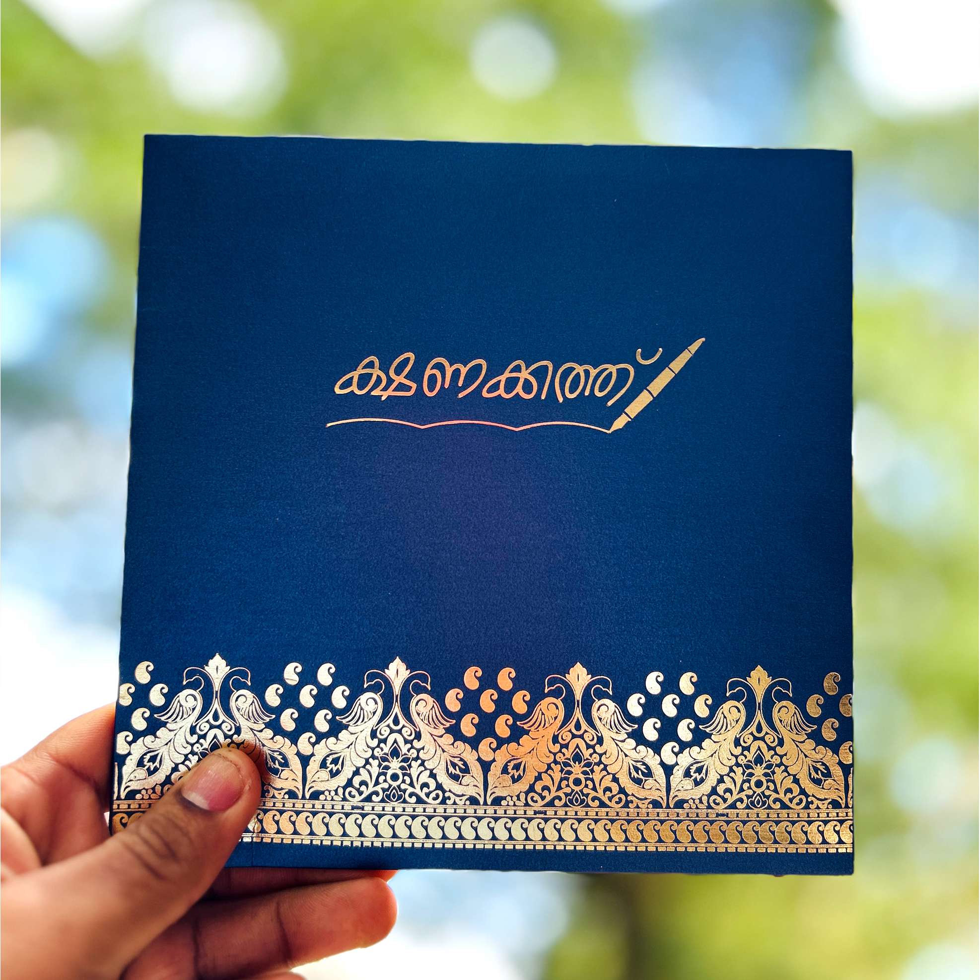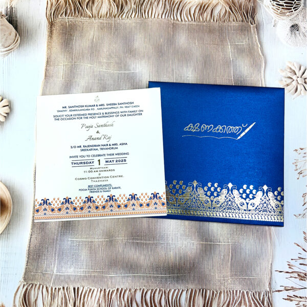 A luxurious wedding card crafted on a rich royal blue background, featuring intricate golden foil detailing at the bottom. The design combines traditional elegance with a modern touch, making it perfect for a grand wedding celebration. The golden script at the center enhances its royal appeal, while the floral border pattern adds a touch of sophistication.