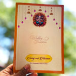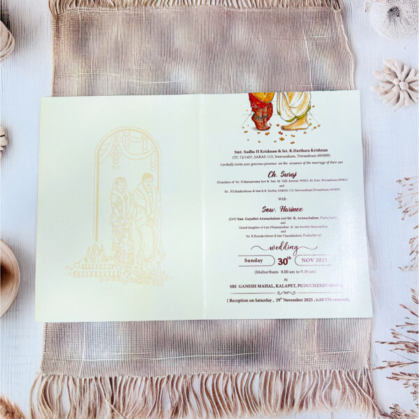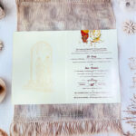 A classic wedding card that radiates tradition and divinity, featuring a beautifully illustrated Lord Ganesha motif at the top. Hanging floral garlands add a festive charm, while the soft beige background with subtle patterns provides elegance. The orange border highlights the design, giving it a warm and auspicious feel, making it perfect for traditional weddings.