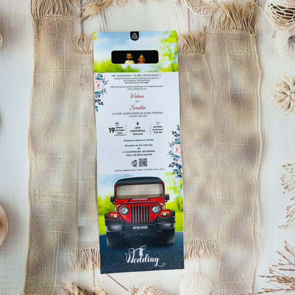 • Jeep-themed wedding card with a realistic illustrated design.